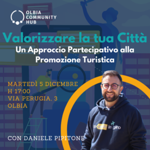 Martedì 5 dicembre dalle 17:00 alle 19:00 presso il Community Hub di Via Perugia, 3 a Olbia si svolgerà l’incontro dal titolo “Valorizzare la tua Città – Un Approccio Partecipativo alla Promozione Turistica“.