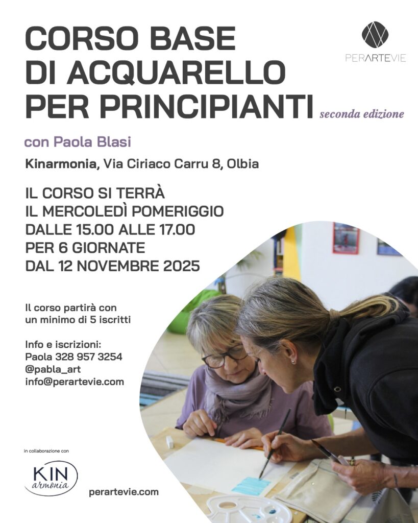 Dopo il successo della prima edizione l’Associazione Per Arte Vie in collaborazione con l’A.s.d. Kinarmonia – Armonia del Movimento organizza anche per il 2025 il Corso base di acquerello per principianti, guidato da Paola Blasi.